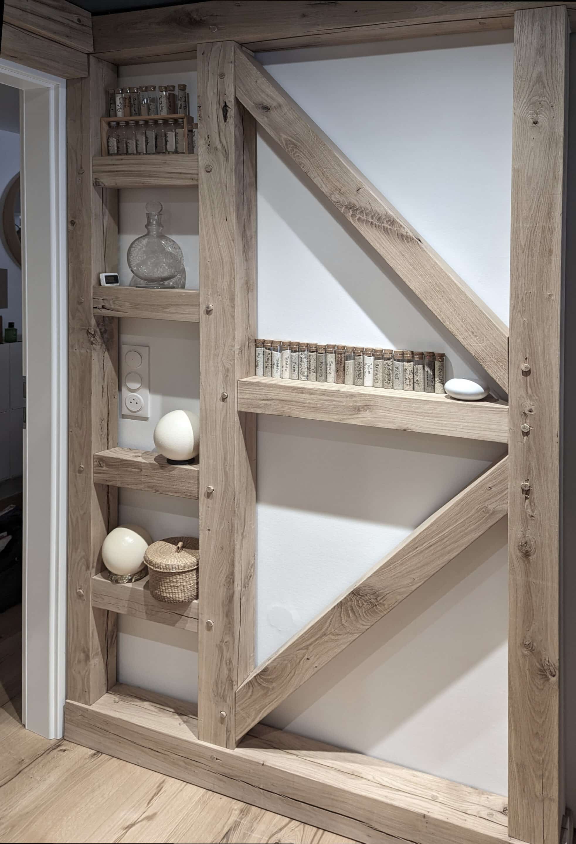 Entre murs à colombages, étagères et mobilier, le chêne est prêt à traverser les années, comme dans une veille maison rénovée.
