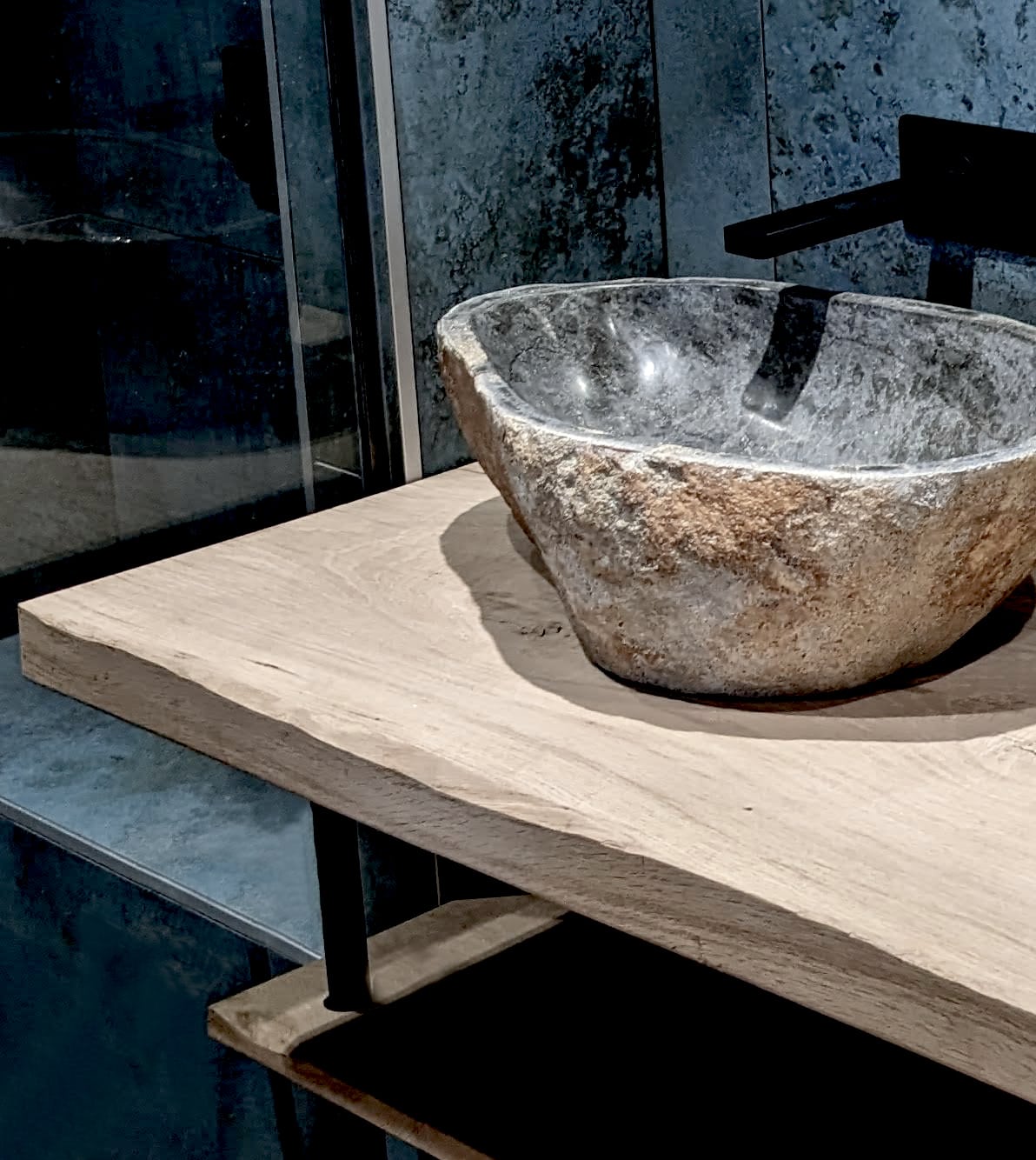 Dans la salle de bain, la recherche de caractère dans les matériaux a motivé le choix d’une vasque en pierre naturelle et celui de la faîence.